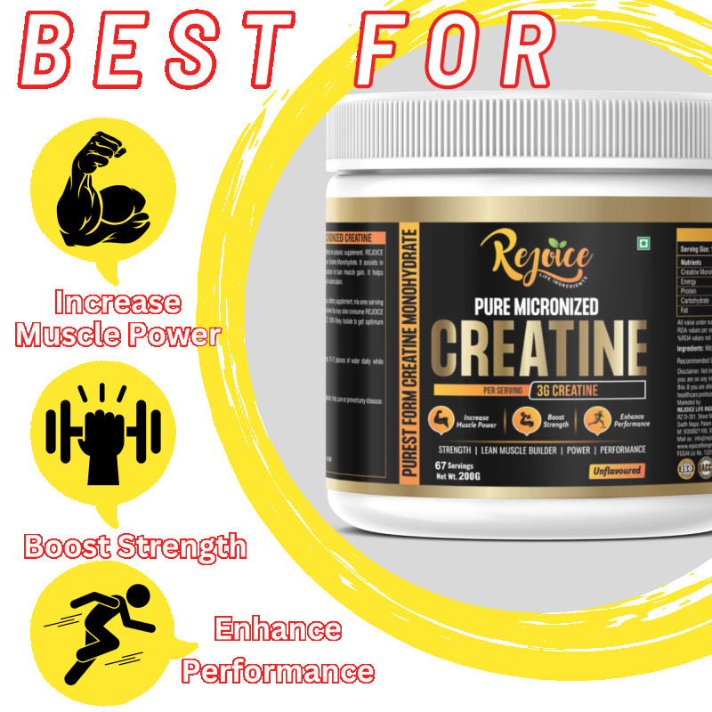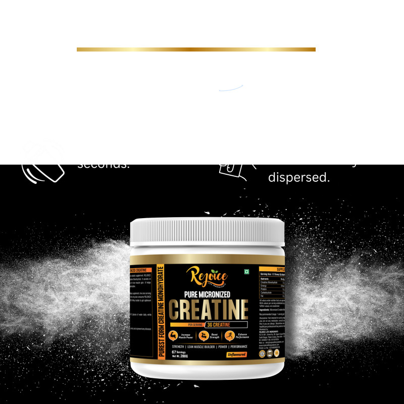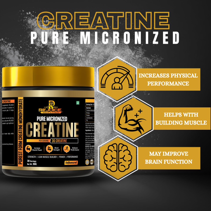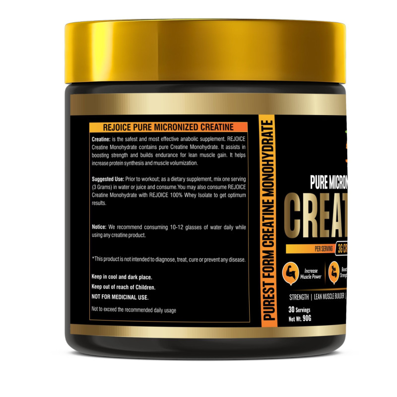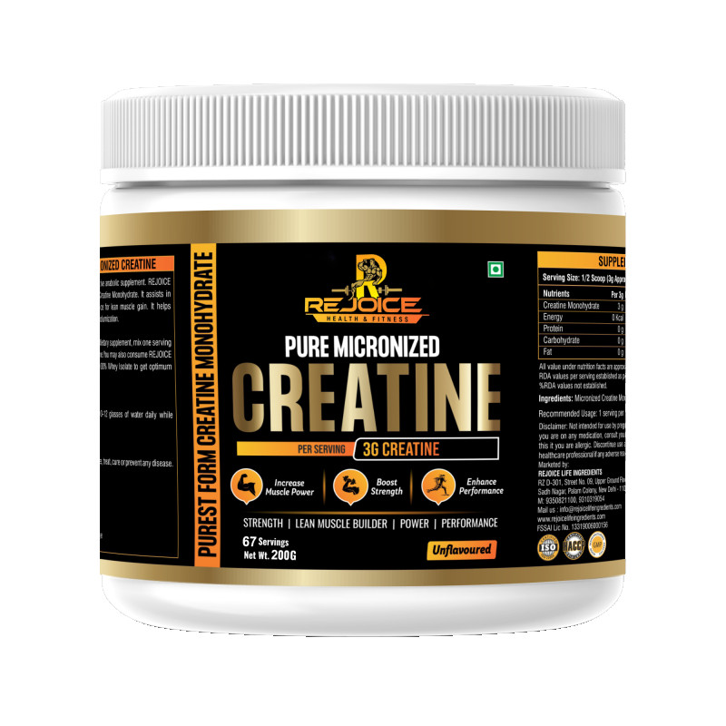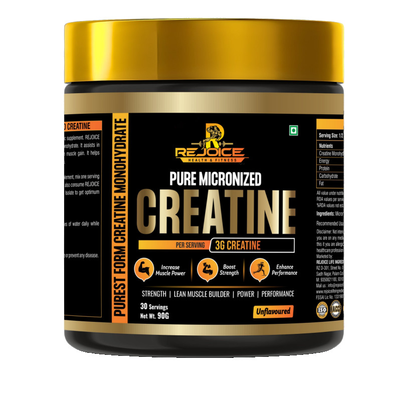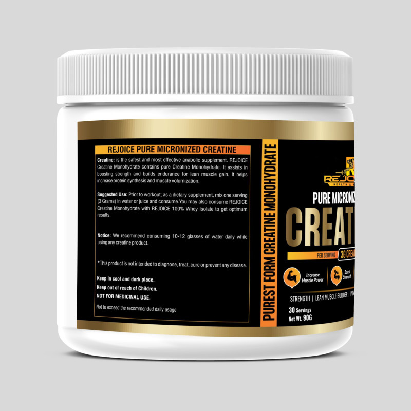 Rejoice Health & Fitness Pure Micronized Creatine Monohydrate is a premium-quality supplement designed to improve physical performance, increase strength, and support lean muscle building. Each serving delivers 3 grams of pure creatine monohydrate to help enhance muscle power, boost workout intensity, and improve overall athletic performance.