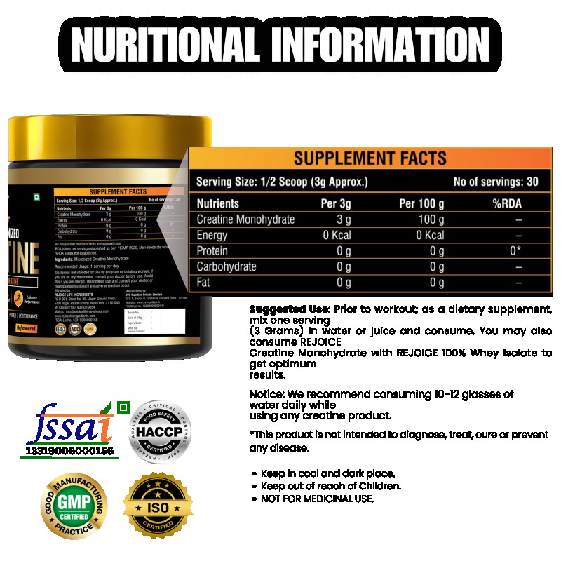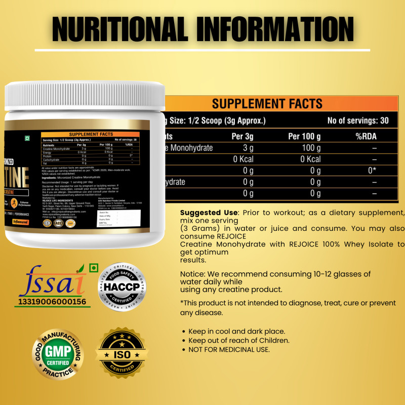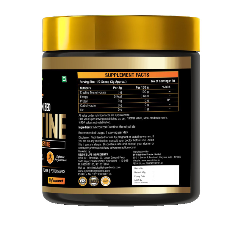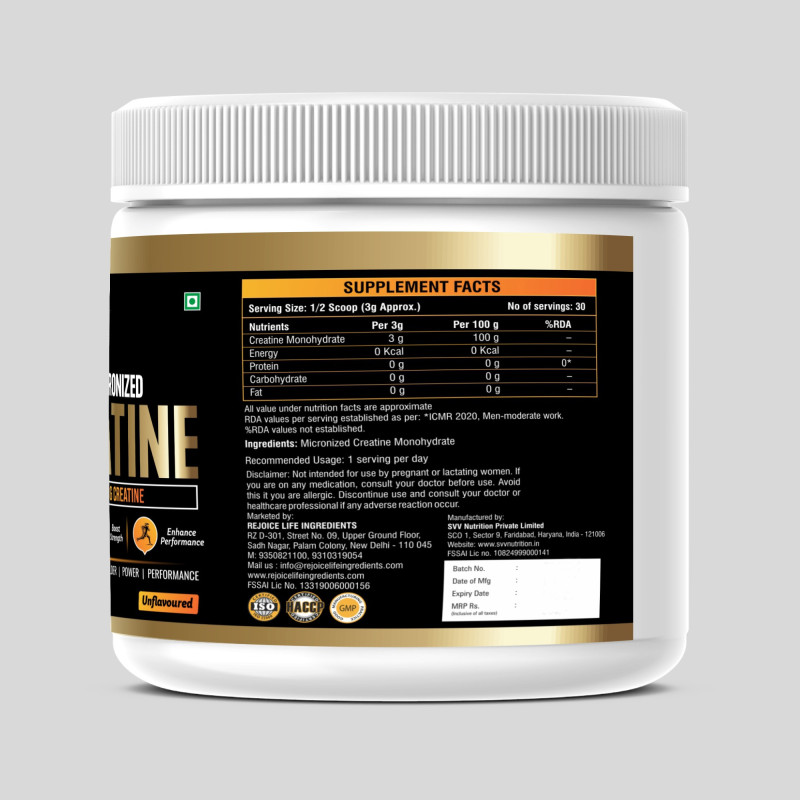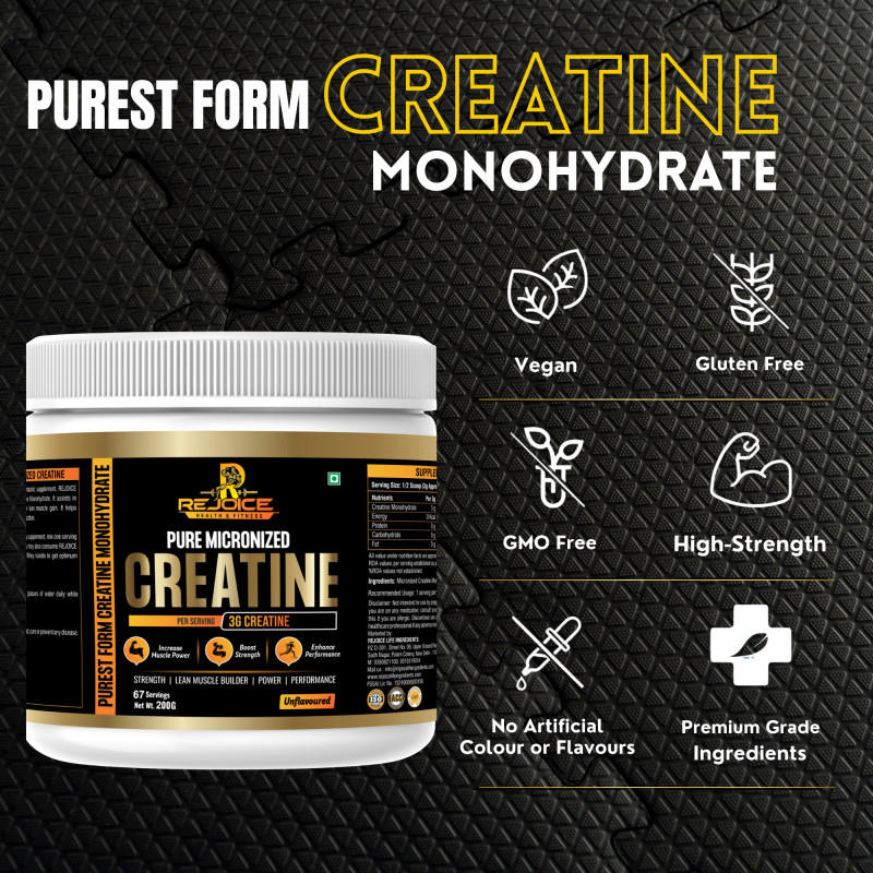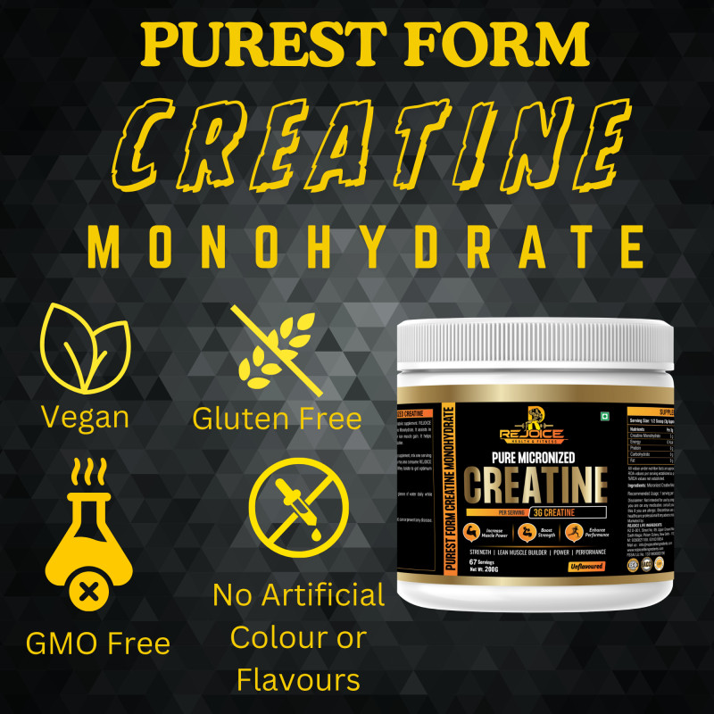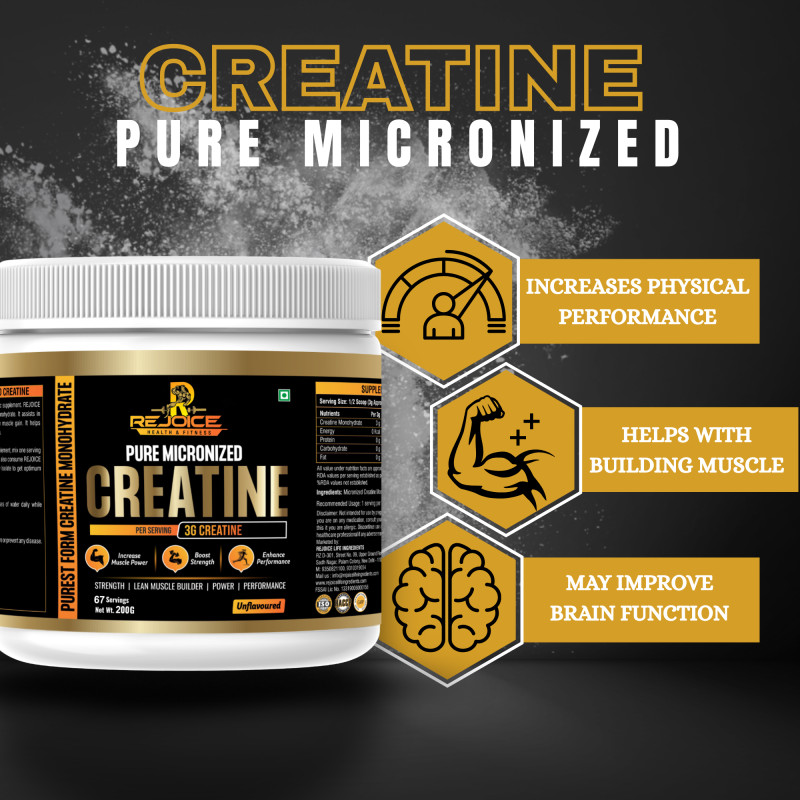 Rejoice Health & Fitness Pure Micronized Creatine Monohydrate is a premium-quality supplement designed to improve physical performance, increase strength, and support lean muscle building. Each serving delivers 3 grams of pure creatine monohydrate to help enhance muscle power, boost workout intensity, and improve overall athletic performance.