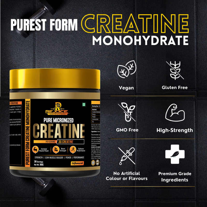 Rejoice Health & Fitness Pure Micronized Creatine Monohydrate is a premium-quality supplement designed to improve physical performance, increase strength, and support lean muscle building. Each serving delivers 3 grams of pure creatine monohydrate to help enhance muscle power, boost workout intensity, and improve overall athletic performance.